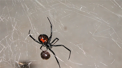 Black WidowThe black widow spider is the most common and harmful spider in California. Venom from its bite can cause reactions ranging from mild to painful and serious, but death is very unlikely and many symptoms can be alleviated if medical treatment is obtained. They and their associated webs usually are found in dark, dry, sheltered, relatively undisturbed places, such as among piles of wood, rubbish or stones, in culverts, hollow stumps and old animal burrows. They can also be found in garages, sheds, barns, crawlspaces, utility meter boxes and outhouses, and sometimes among plants.