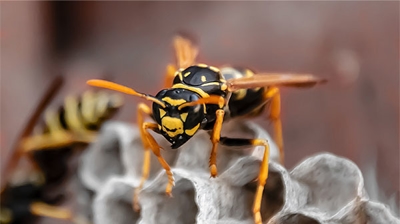 Identifying Characteristics: These wasps tend to be medium-sized and black with jagged bands of bright yellow or white on the abdomen and have a very short, narrow “waist,” the area where the thorax attaches to the abdomen.